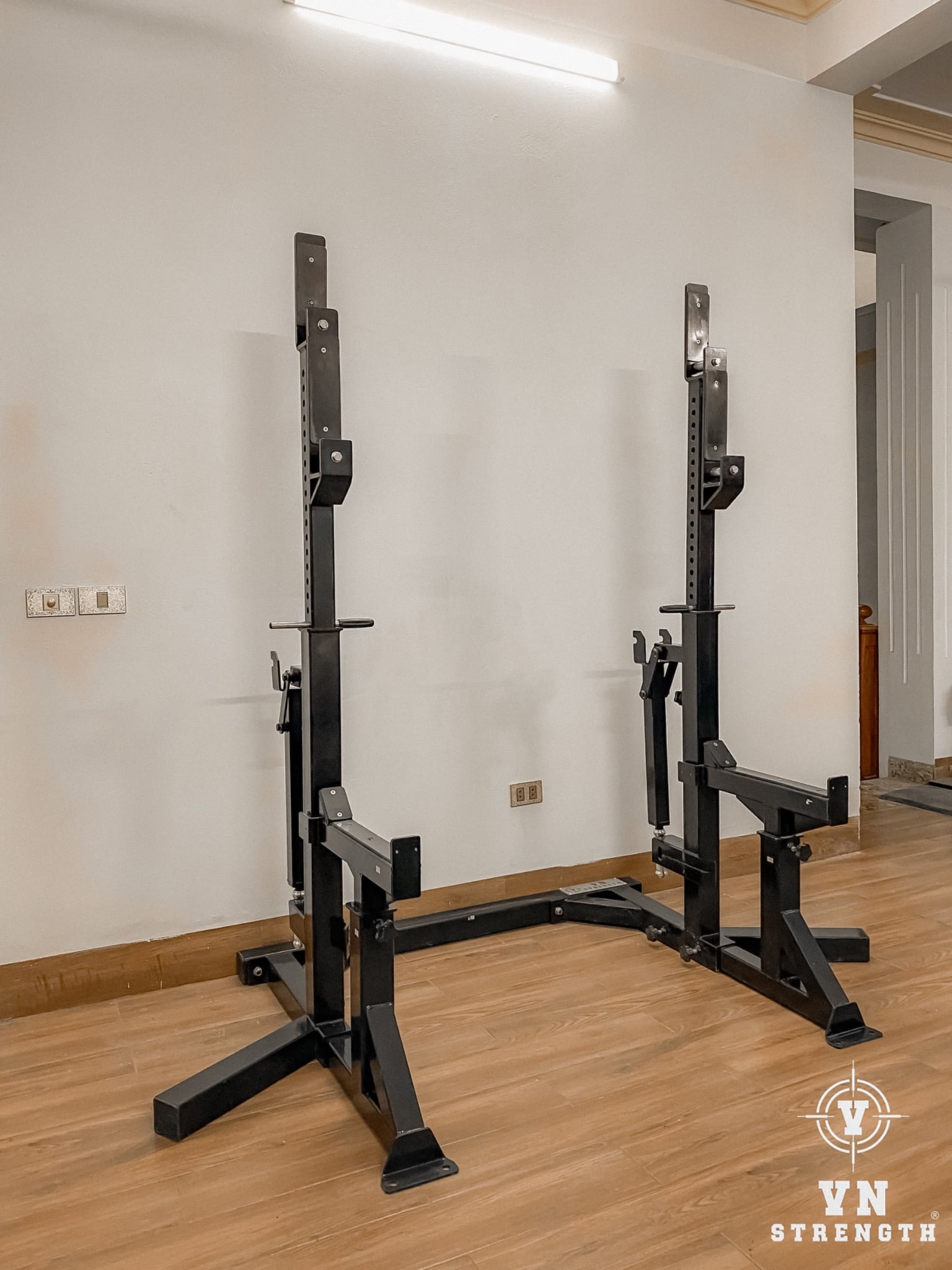 Đây là thiết kế 2 trong 1 cho phép người nâng tạ ngồi xổm và ngồi xổm dù là ở nhà riêng và/hoặc trong các cuộc thi đấu. Sử dụng đế rộng để có độ ổn định hoàn toàn khi chịu tải nặng, giá đỡ có các thanh đứng có thể điều chỉnh, đi kèm với hai tay đòn ở mặt sau. Chúng sẽ giữ chặt dưới các chốt và hướng thanh tạ lên hoặc xuống. Trong cuộc thi, đây là lý tưởng để điều chỉnh chiều cao thanh tạ nhanh chóng và hiệu quả mà không cần phải tháo đĩa tạ ra khỏi thanh tạ.