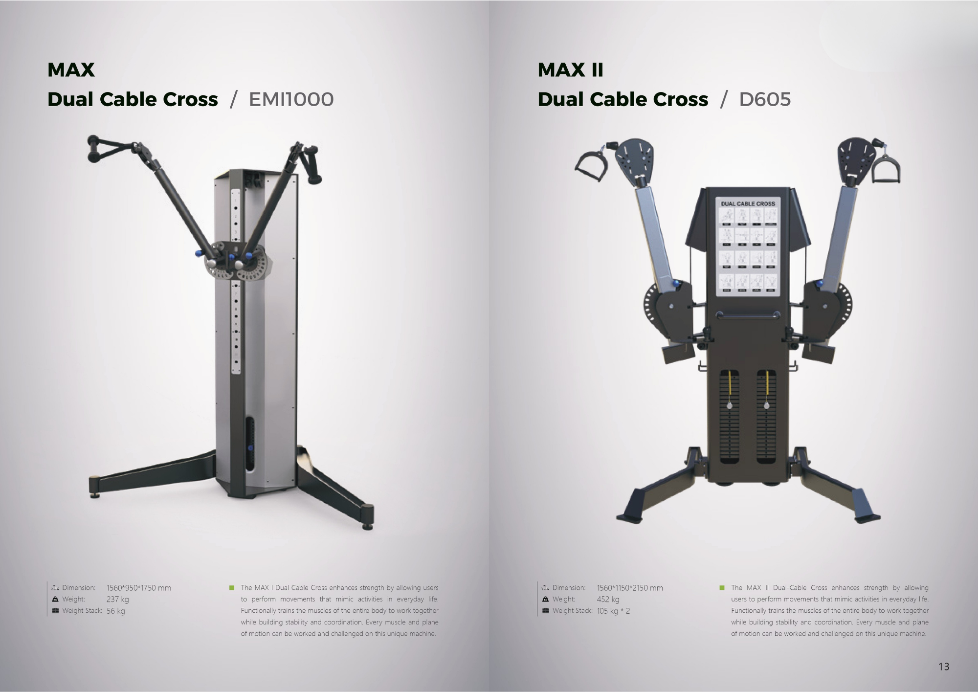 D605 - Máy tập đa năng MAX II Dual Cable Cross tăng cường sức mạnh bằng cách cho phép người dùng thực hiện các động tác mô phỏng các hoạt động thường ngày. Máy tập này giúp rèn luyện chức năng các cơ trên toàn bộ cơ thể, giúp chúng phối hợp nhịp nhàng, đồng thời tăng cường sự ổn định và khả năng phối hợp. Mọi cơ bắp và mặt phẳng chuyển động đều có thể được rèn luyện và thử thách trên chiếc máy độc đáo này.