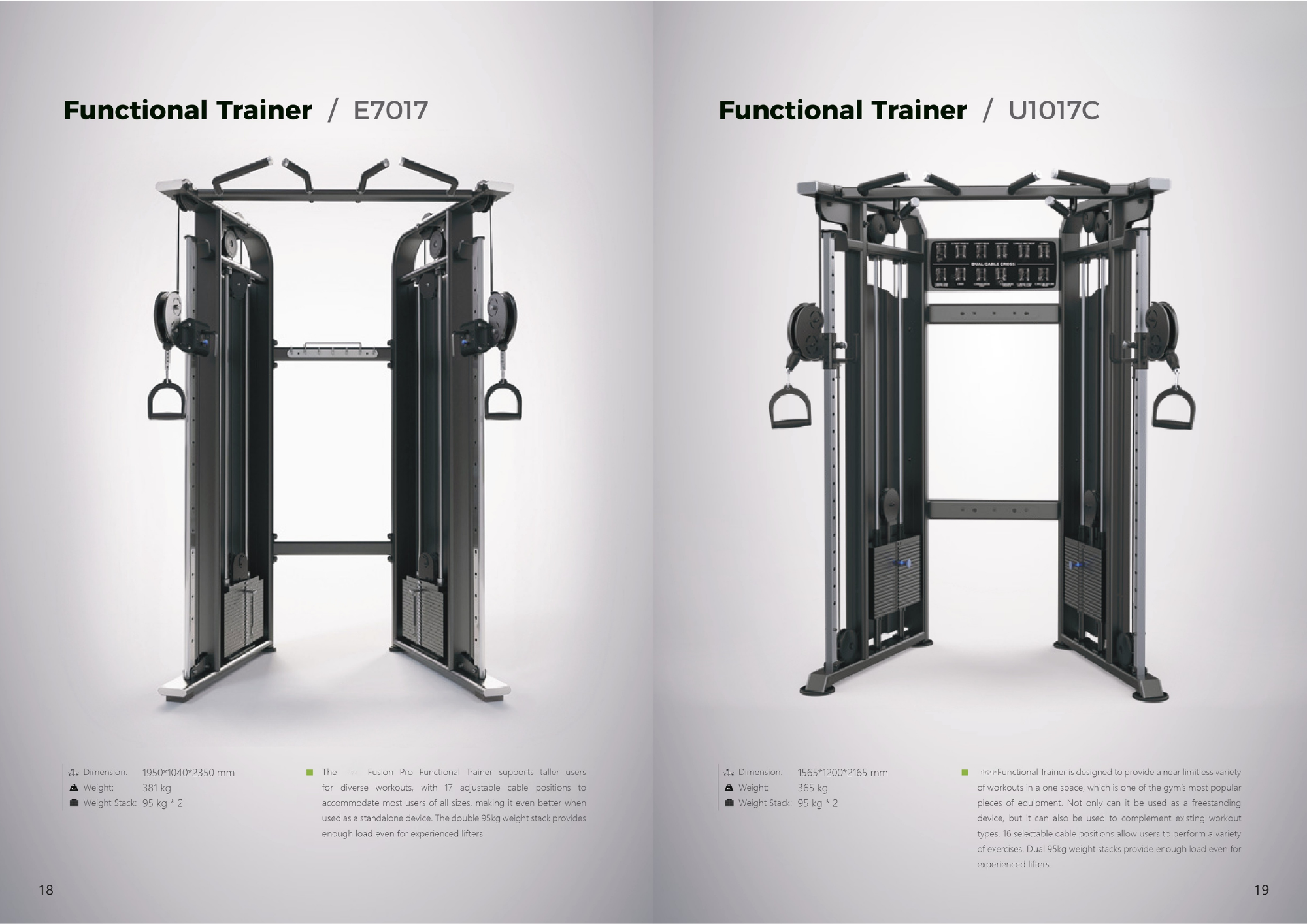 E7017 - Máy tập chức năng Fusion Pro Series hỗ trợ người dùng cao lớn với nhiều bài tập đa dạng, với 17 vị trí dây cáp có thể điều chỉnh phù hợp với hầu hết người dùng ở mọi kích cỡ, giúp sản phẩm trở nên hoàn hảo hơn khi sử dụng độc lập. Trọng lượng tạ đôi 95kg cung cấp đủ tải trọng ngay cả với những người tập tạ chuyên nghiệp.