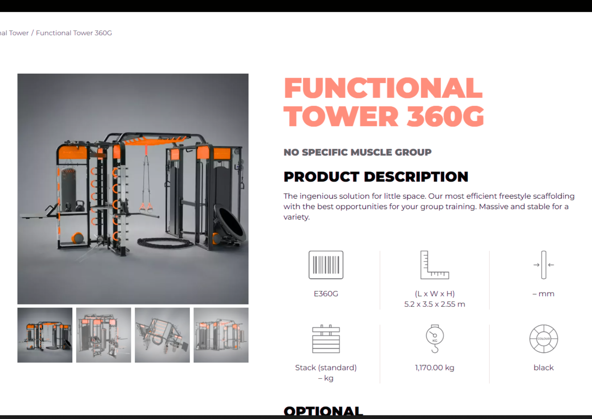 Giải pháp thông minh cho không gian nhỏ. Giàn giáo tự do hiệu quả nhất của chúng tôi mang đến cơ hội luyện tập nhóm tốt nhất. Rộng rãi và ổn định cho nhiều mục đích. E360G (D x R x C) 5,2 x 3,5 x 2,55 m – mm Stack (tiêu chuẩn) – kg 1.170,00 kg đen