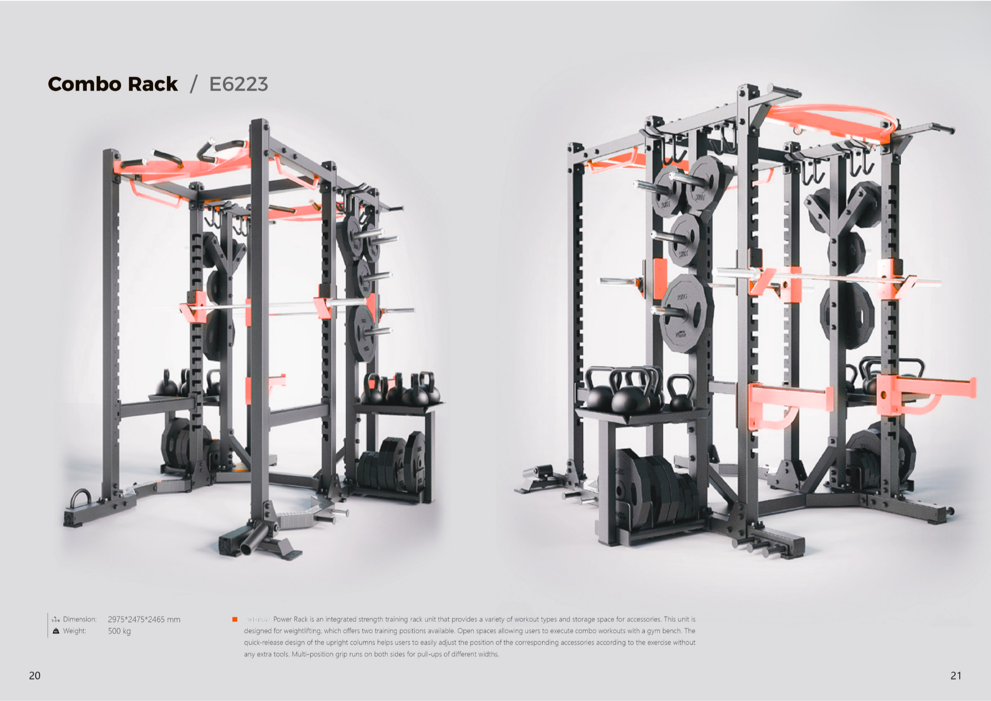 Kích thước 2980 x 2480 x 2470 mm Kích thước khung 75 x 75 x T3 mm Hộp vận chuyển 2540 x 1120 x 640 mm Gỗ dán Màu khung Màu ứng dụng Trọng lượng tịnh / tổng 500 kg / 530 kg Tải trọng tối đa -- Gói tạ khuyến nghị -- Lưu trữ tạ 8 Giá đỡ tạ VN-Strength ® Power Rack là một giá đỡ tập luyện sức mạnh tích hợp, cung cấp nhiều loại bài tập khác nhau và không gian lưu trữ cho các phụ kiện. Có hai vị trí tập luyện để nâng tạ. Sản phẩm cho phép tập luyện kết hợp với ghế tập thể dục và có các cột tháo lắp nhanh để dễ dàng điều chỉnh phụ kiện mà không cần dụng cụ bổ sung. Tay cầm đa vị trí cho phép kéo xà ở nhiều độ rộng khác nhau.