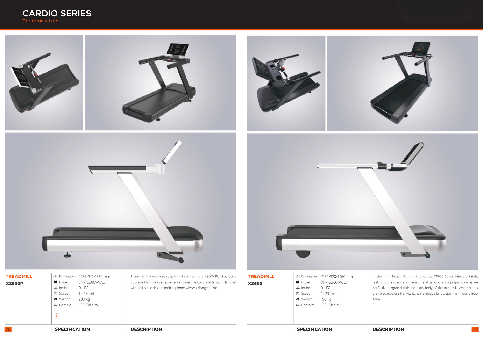 Kích thước: Công suất: Độ nghiêng: Tốc độ: Trọng lượng: Bảng điều khiển: MÔ TẢ THÔNG SỐ KỸ THUẬT 2180*910*1530 mm 3HP/2200W/AC 0~15° 1~20km/h 200 kg Màn hình LED Nhờ chuỗi cung ứng xuất sắc của VN-Strength®, X8600 Plus đã được nâng cấp để mang đến trải nghiệm người dùng tốt hơn với chi phí hợp lý. Tay vịn với thiết kế chống tĩnh điện, sạc không dây cho điện thoại di động, v.v.