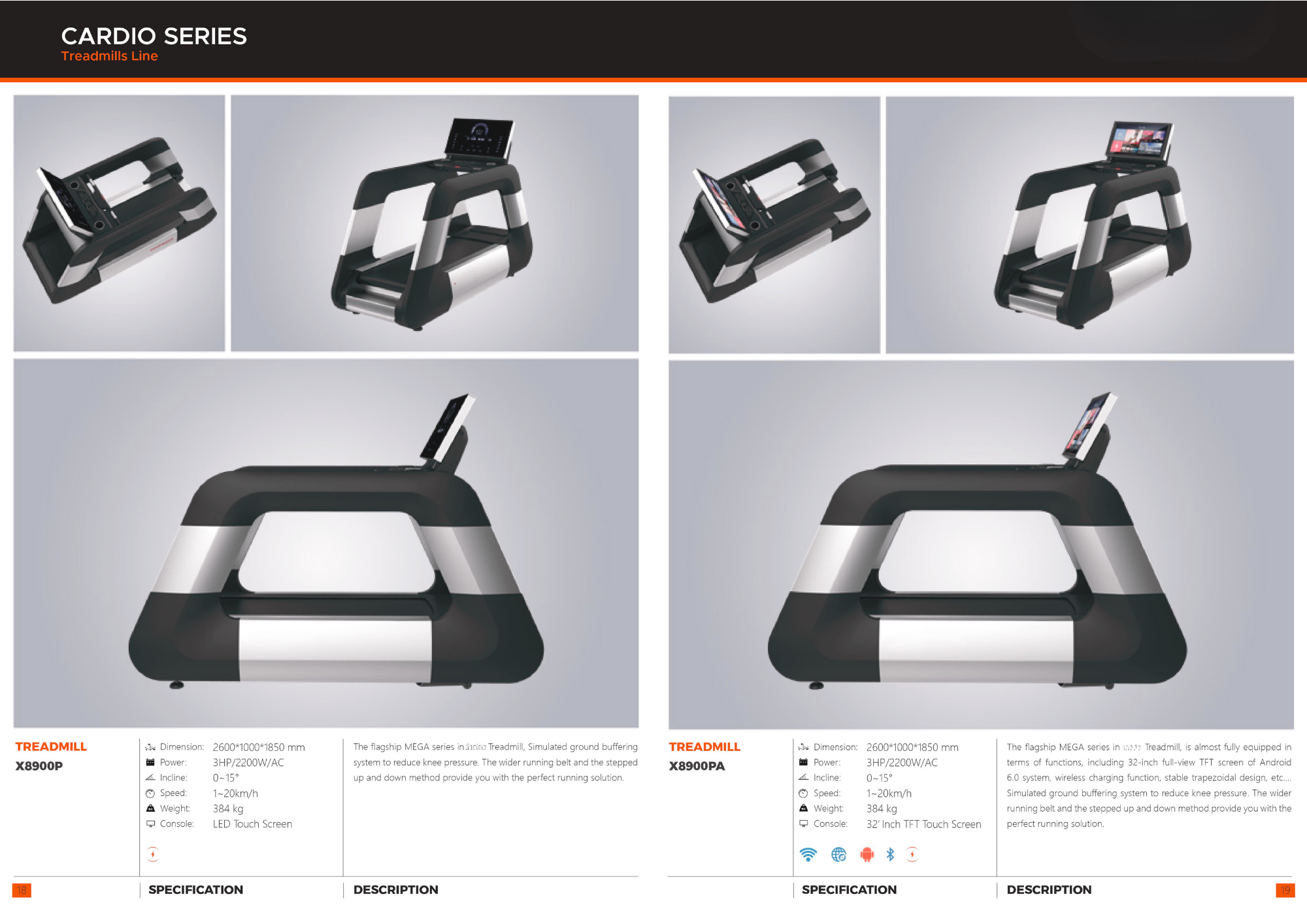 Kích thước: Công suất: Độ nghiêng: Tốc độ: Trọng lượng: Bảng điều khiển: MÔ TẢ THÔNG SỐ KỸ THUẬT 2600*1000*1850 mm 3HP/2200W/AC 0~15° 1~20km/h 384 kg Màn hình cảm ứng LED Dòng máy chạy bộ MEGA hàng đầu với hệ thống đệm mô phỏng mặt đất giúp giảm áp lực lên đầu gối. Băng chạy rộng hơn và phương pháp lên xuống theo bậc thang mang đến cho bạn giải pháp chạy bộ hoàn hảo.